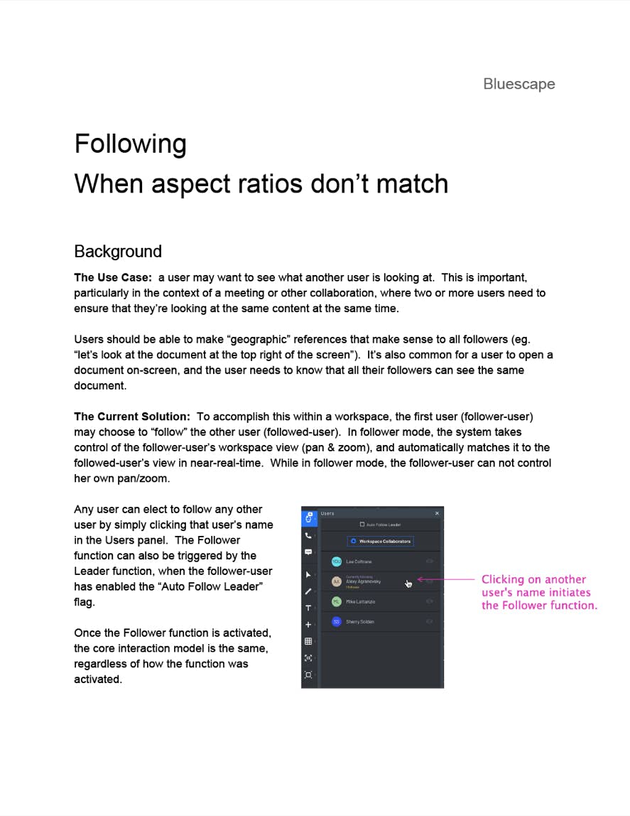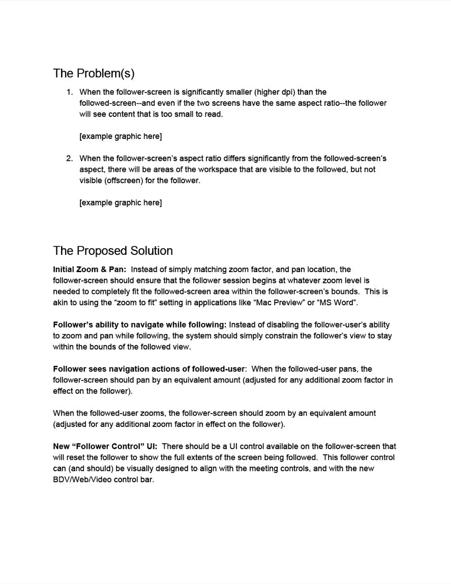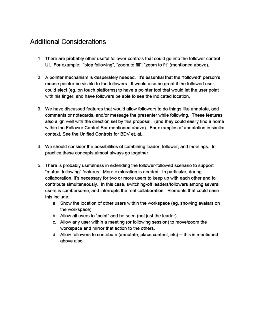 White paper presenting a novel navigation model for a virtual collaborative workspace. This model proposes how content developers may customize what audiences see on their screens during shared visual experiences.