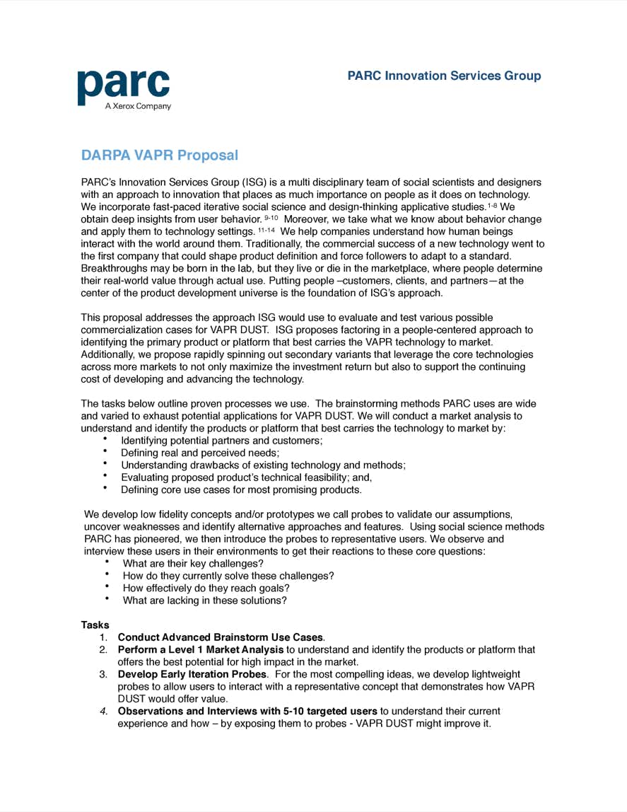 Proposal to expand a partnership with DARPA. PARC developed a a self-destructing material technology. I collaborated with engineering and science labs to commercialize this technology.