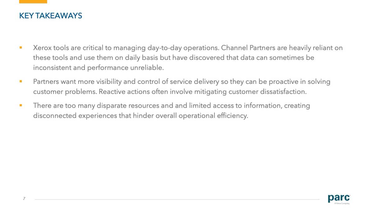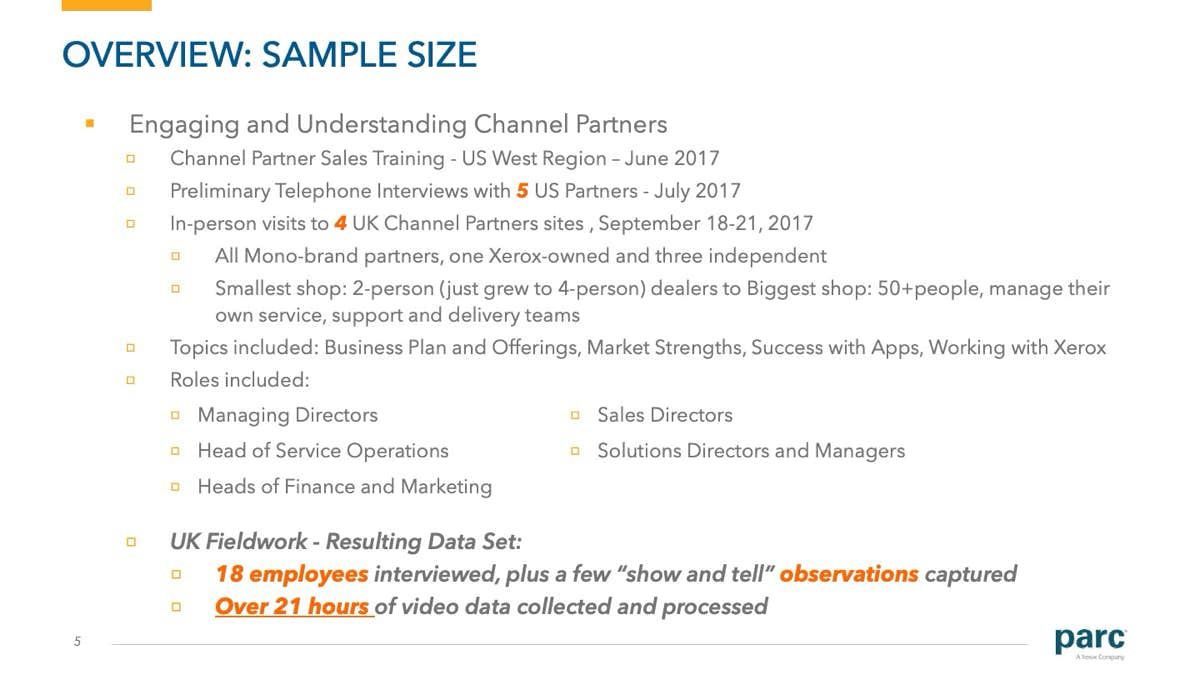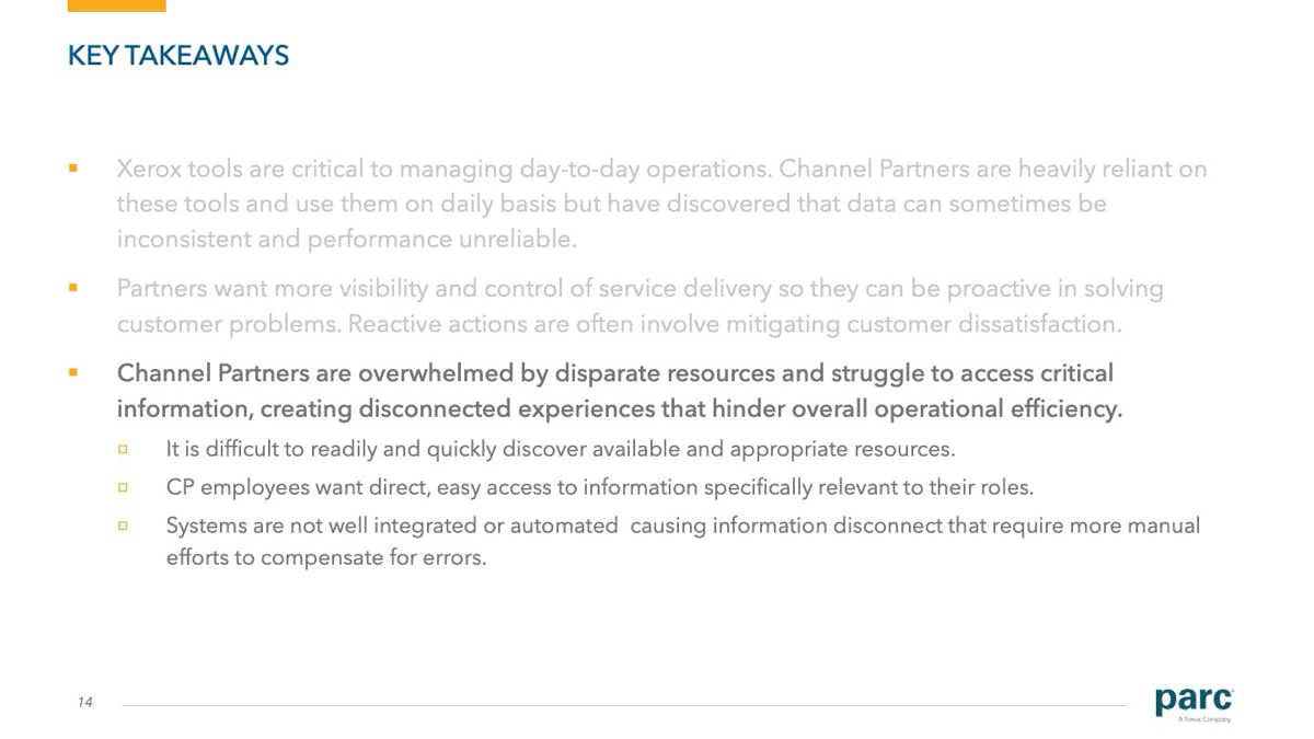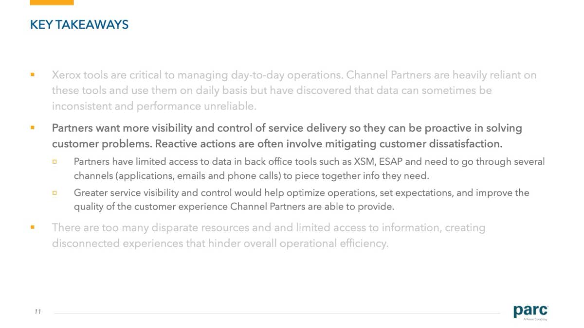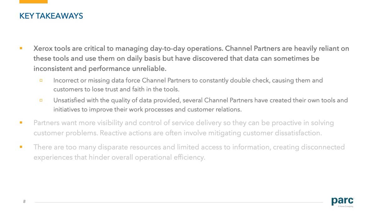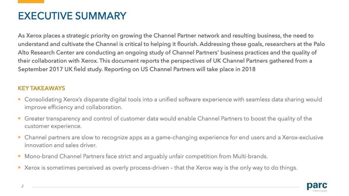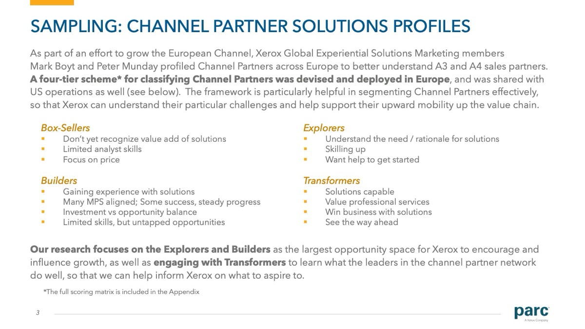 Pitched, executed, synthesized and reported on Xerox’s Channel Business operations collaborating with the office of the CTO to revise a Xerox’s marketing and distribution strategy. Orchestration included ownership of the entire research operation including scoping, methodology selection, recruiting, prototyping, and fieldwork—adapting between rigorous and scrappy approaches as needed.