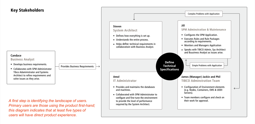 The other step, in parallel, was learning about system architecture (service assemblies, nodes, containers, EMS and UDDI Servers), who created them, what problems they solved, who was affected by them. To know the user roles and goals, I’d have to understand the day-to-day work the people in these role performed.