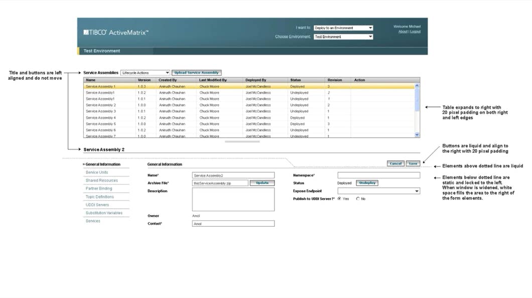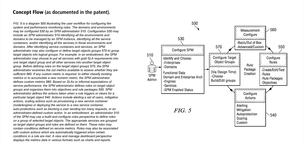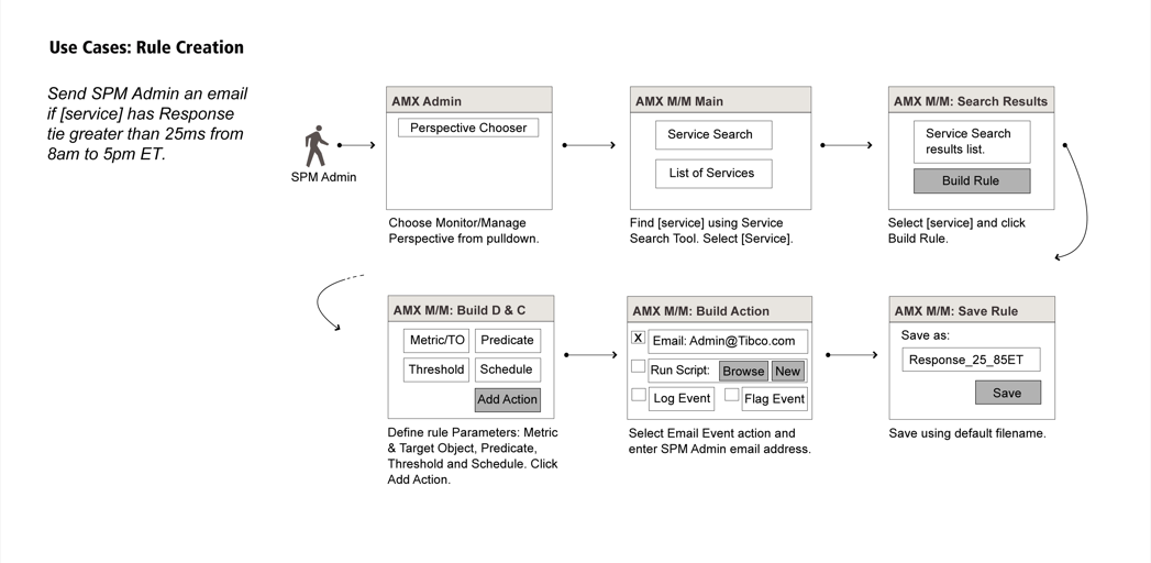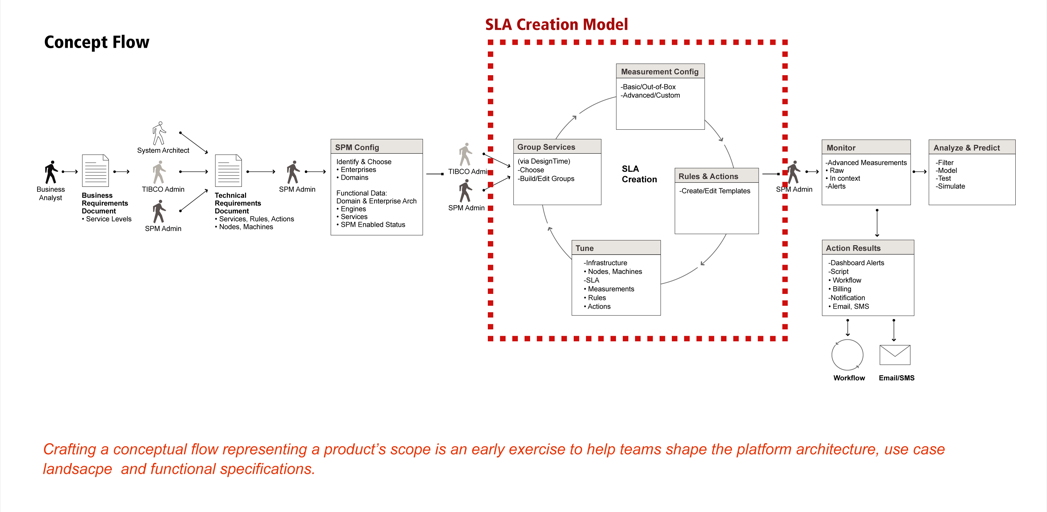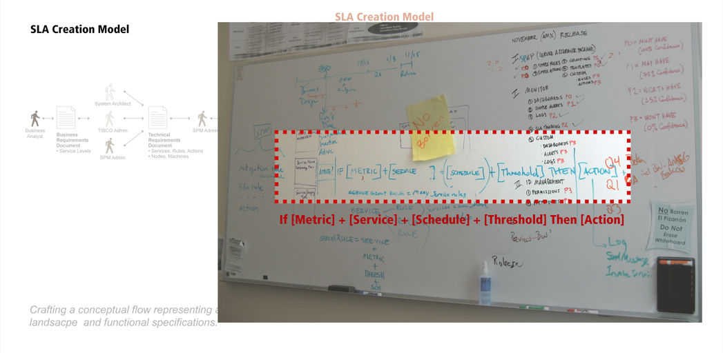 In the absence of any documented product goals, strategy or requirements, I held participatory workshops every Tuesday and Thursday with key engineering, marketing, and sales stakeholders and semi-regular guests such as Tibco’s CTO and important customers (e.g., Delta Airlines architects, engineers) to create clarity and achieve consensus: Tuesdays were spent discussing business goals, stakeholder needs, strategy and design; on Thursdays we’d critique and refine the concept models, information architecture, workflows, wireframes, functional specs and prototypes I’d executed in the meantime with the goal of cementing decisions. Artifacts from these sessions, and corresponding patent documentation shown in the galleries below..